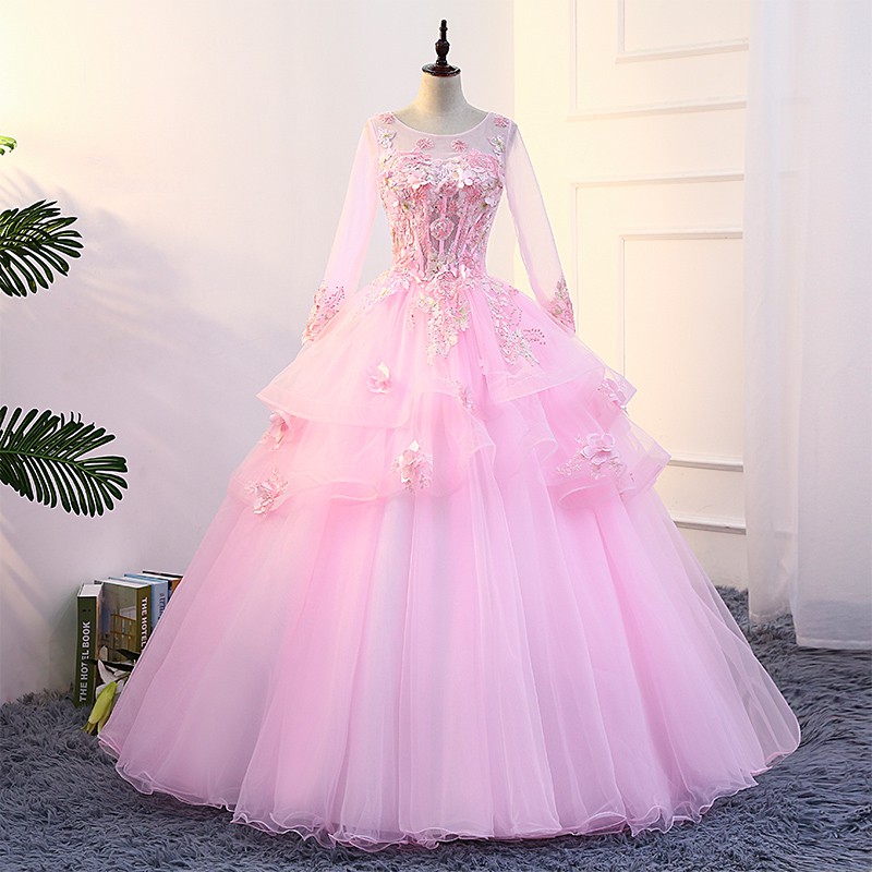 Gracious Long Sleeves 3d Floral Lace Applique Light Pink Ball Gown