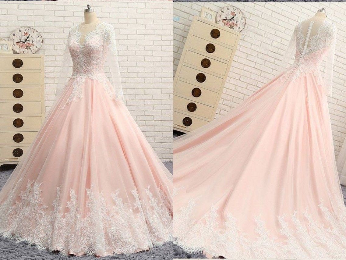 Pink Lace Long Sleeves Ball Gowns Wedding Dresses Alinanova